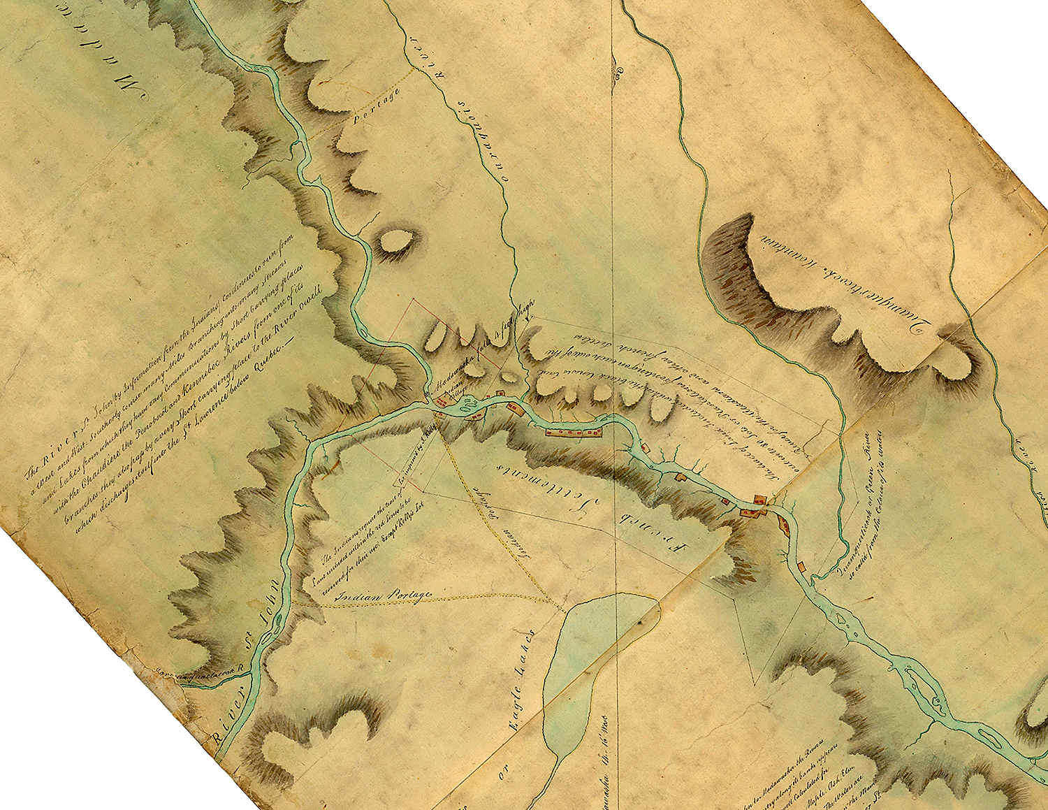 Une carte de la rivière St. Jean est tracée (Wəlastəkw) montrant un village autochtone au Madawaska (Matoweskok). Elle porte le cachet du conseil d’administration, en faisant une carte militaire officielle.