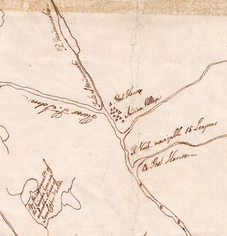 Une carte de la rivière St. Jean est tracée (Wəlastəkw) montrant un village autochtone au Madawaska (Matoweskok). Elle porte le cachet du conseil d’administration, en faisant une carte militaire officielle.
