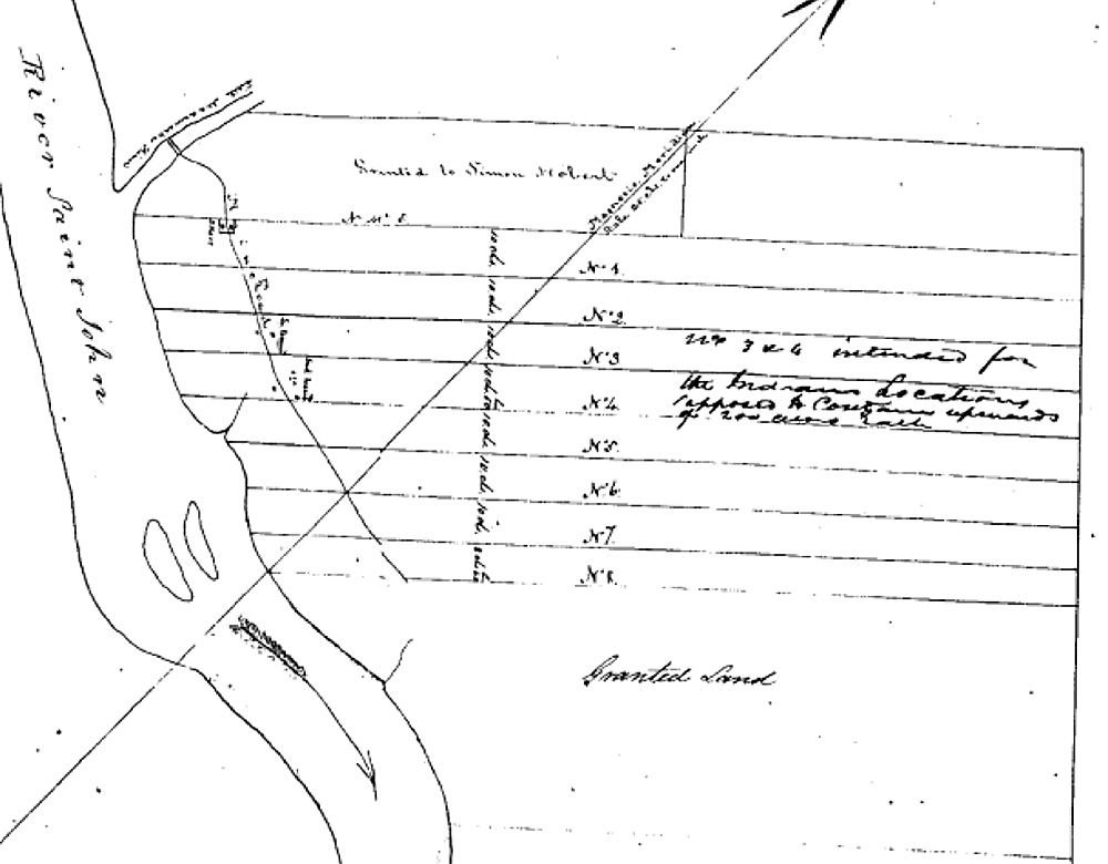 Plan attaché à la subvention de 1790 à “Joseph Mazerolle & 48 autres”. George Sproule [1790] PANB, MC1236.
